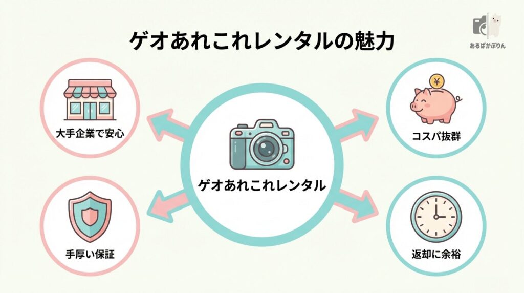 「ゲオあれこれレンタルの4つの魅力」をご紹介します。