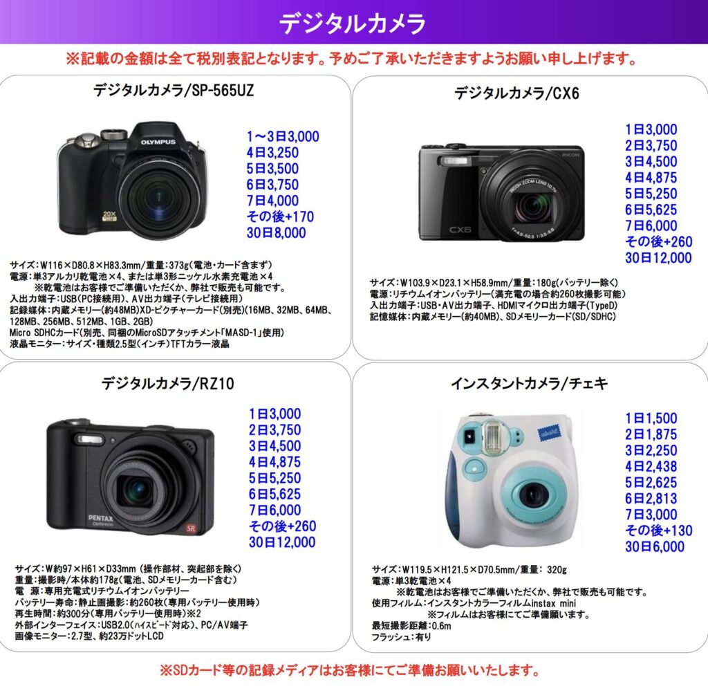 カメラ以外にも、祭り用品(かき氷機・屋台器具など)、音響・映像機器、照明機器、テント・パーティー備品、展示会什器、OA機器、仮設ハウスなど、豊富なカテゴリのアイテムを取り扱っています。